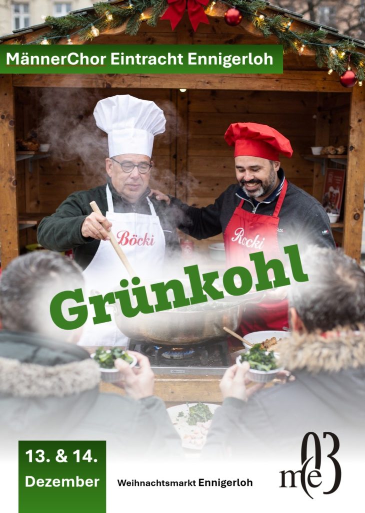 Der Männerchor Eintracht Ennigerloh ist in diesem Jahr zum ersten Mal auf dem Weihnachtsmarkt dabei und versorgt euch mit einer ordentlichen Portion Wärme von innen.Kommt vorbei, sagt Hallo, schnappt euch eine Portion Grünkohl und unterstützt damit unseren Chor. Ob als Stärkung zwischendurch oder als „muss man gehabt haben“-Klassiker: Das lohnt sich!